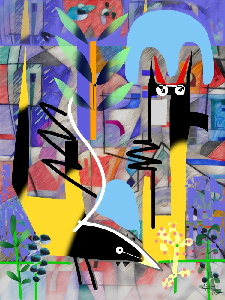 This work explores the tension between structured geometry and organic fluidity. By layering deep violets against jolts of electric yellow, the piece creates a visual "dialogue" where colors act as voices. The abstract, totemic figures serve as the focal points of this exchange—captured in a moment where a chaotic clash of ideas finds a rhythmic, vibrant harmony.