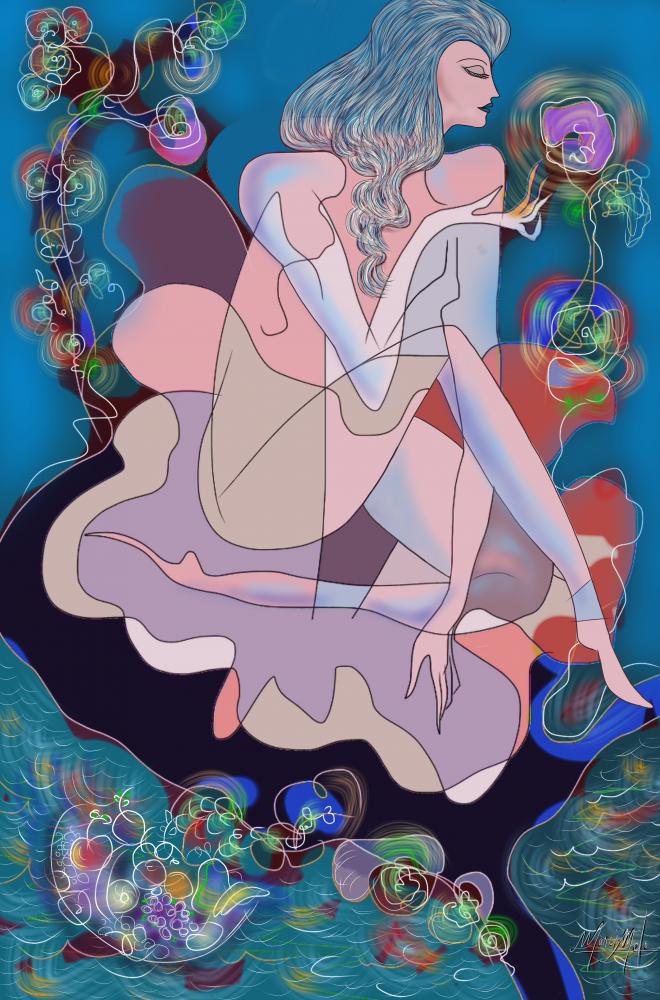 This vibrant and abstract painting features a woman as the central figure. She is depicted in a soft, ethereal manner with flowing blue hair and a serene expression. Her body is composed of geometric shapes and lines, giving her a stylized and almost sculptural appearance. The woman appears to be surrounded by a floral motif, with delicate pink and purple flowers blooming around her. This creates a sense of harmony and tranquility. The background is a deep blue, suggesting water or the sky, and there are swirling patterns that add to the overall sense of movement and energy. The painting's color palette is predominantly soft and muted, with the blue and pink tones creating a calming atmosphere. However, there are also hints of brighter colors, such as orange and yellow, that add depth and visual interest. Overall, this artwork is a visually striking and thought-provoking piece that invites the viewer to contemplate themes of beauty, nature, and the human form.