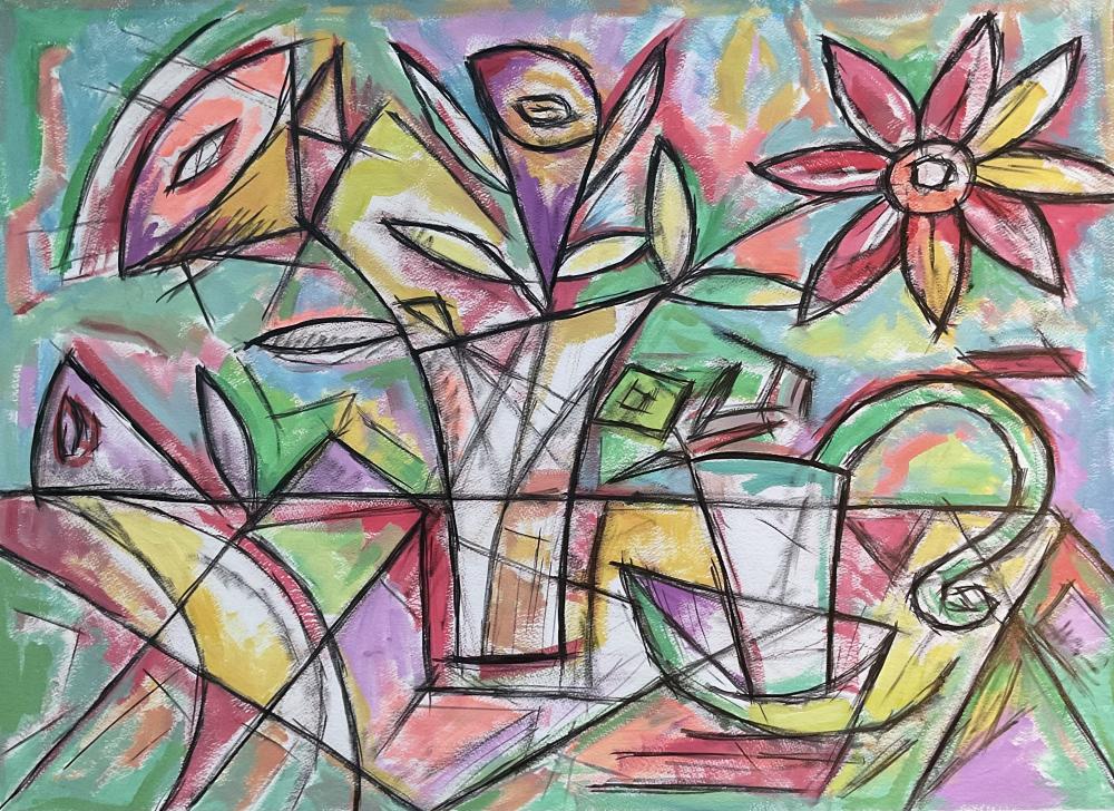 Le tableau est une nature morte florale très stylisée. Les formes sont fortement géométrisées et délimitées par un trait noir épais et dynamique. Cette déconstruction des formes est typique du cubisme, où les objets sont représentés sous de multiples angles simultanément.