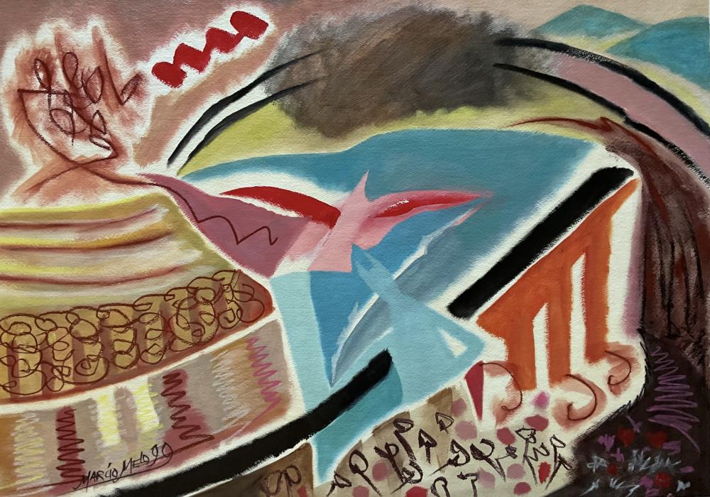 Cette œuvre est une peinture figurative abstraite ou un paysage abstrait, caractérisée par une composition dynamique, l'utilisation de couleurs vives et un mélange de techniques allant de l'aplat de couleur au dessin linéaire.