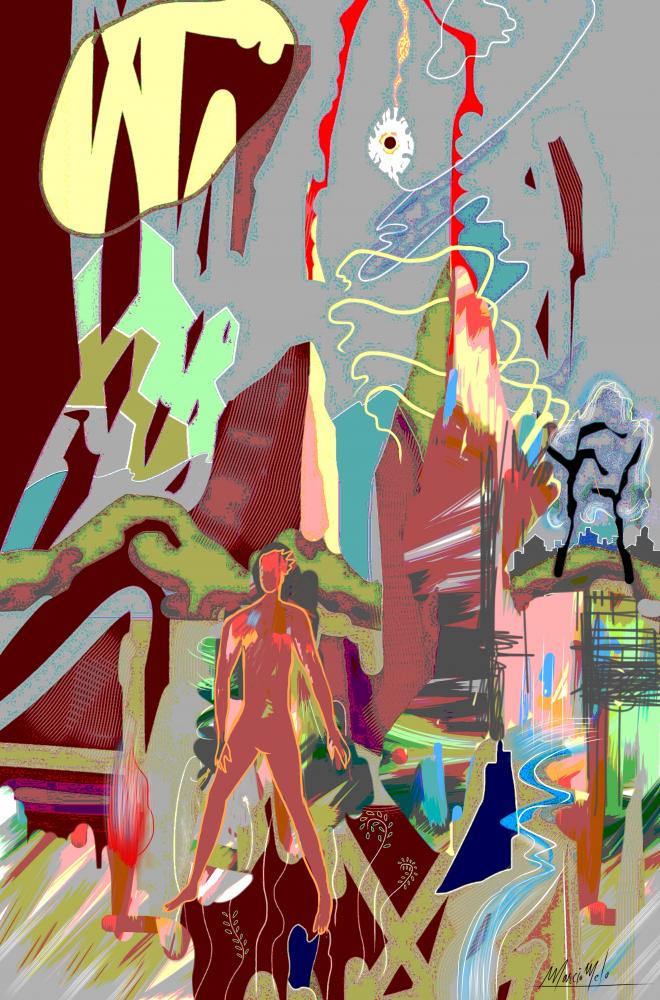 The digital painting titled "Living with the Elements" by Marcio Melo depicts a vibrant and abstract scene. The artwork features a bold, central figure that appears to be walking through a landscape filled with swirling colors and patterns. The colors used are bright and energetic, creating a sense of movement and energy. The composition is dynamic and engaging, with the figure and elements of the landscape interacting in a visually interesting way. The painting's title suggests a possible theme of harmony or coexistence between humans and nature.