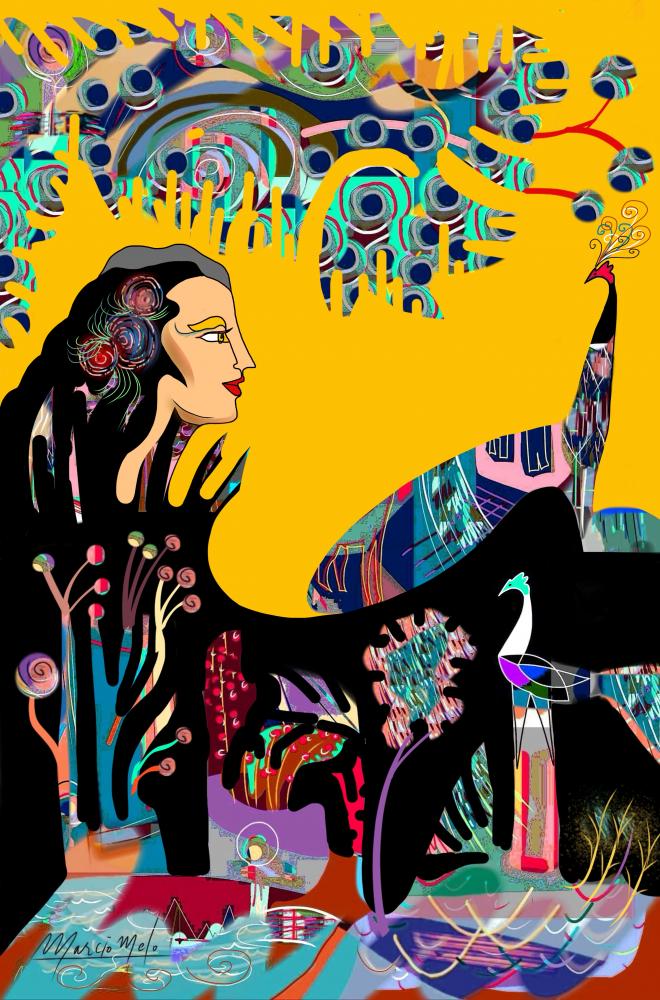 This vibrant digital painting by Marcio Melo features a striking, stylized woman with bold, black lines outlining her features and a striking red lip. She is set against a bright yellow background that contrasts dramatically with the darker tones of her figure and the intricate details of her clothing and surroundings. A peacock, rendered in a similar bold style, stands beside her, its plumage adding to the overall vibrancy of the piece. The woman's expression is enigmatic, with her eyes partially closed and her lips set in a neutral pose. The intricate patterns and textures in her clothing and the peacock's feathers suggest a rich cultural or symbolic meaning. The overall atmosphere of the painting is one of mystery and intrigue, with the bold colors and striking imagery drawing the viewer's attention.