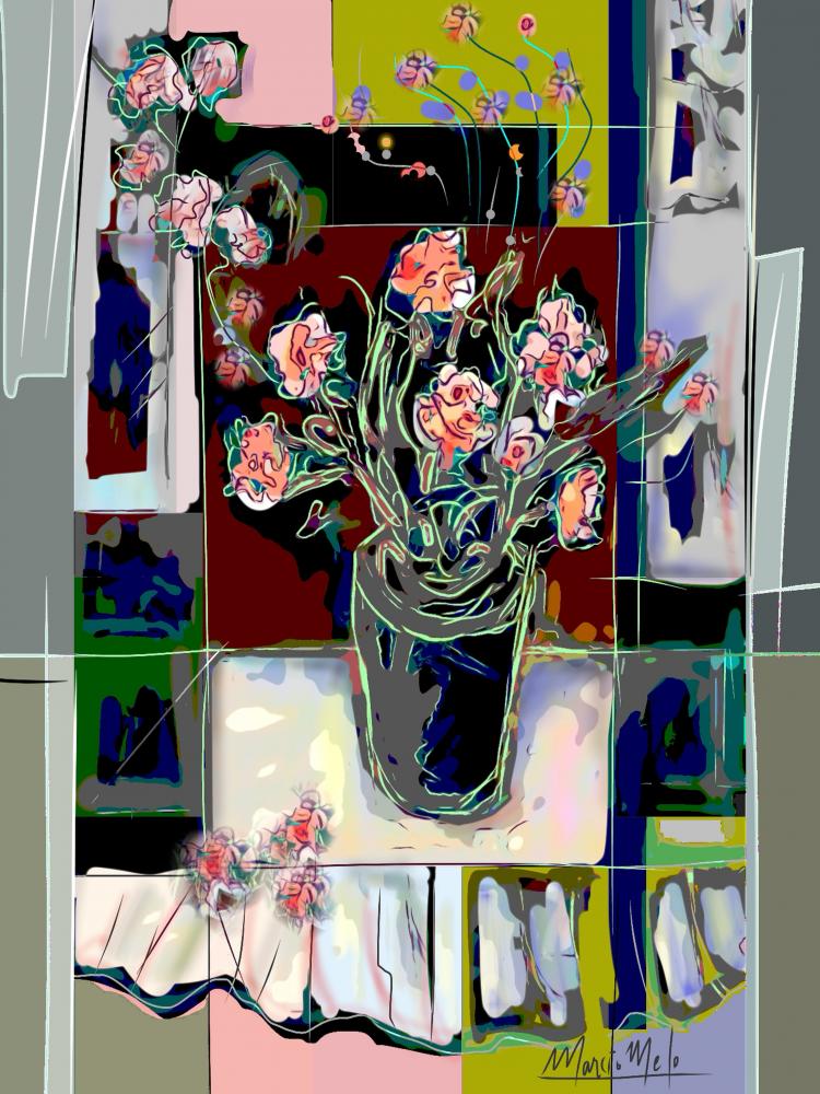 The digital painting "Printemps" by Marcio Melo is a vibrant and colorful depiction of spring. The artwork features a vase filled with a bouquet of delicate flowers, rendered in a style that suggests impressionism or pointillism. The colors are bright and cheerful, evoking the feeling of new life and growth. The composition is balanced and harmonious, with the flowers forming a central focal point. The overall impression is one of joy and optimism.