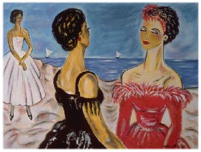 This painting was originally done as a watercolour painting on paper. As a rule, watercolour works best for me when simplified to its basic detail. This process requires precision and concentration, having to change brushes and colours for each of the areas that form the final composition. As a technique, this allows me to be guided by the painting without knowing where it is taking me. This creates interesting effects unanticipated when the painting was started. It was an almost incidental act that made me lift up the arm of the third lady on the sofa (an act that lacked the concentration stated above). I realized that she needed to hold something. "A telephone!", I thought, would pull all the parts of the picture together, giving it an anecdotal sense.