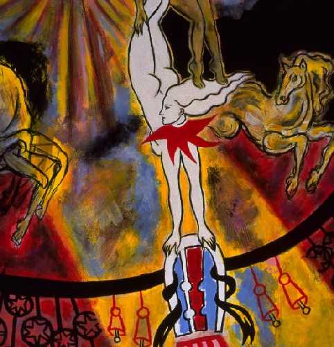Même si le cirque a été une source d'inspiration évidente pour ce tableau, sa signification est plus symbolique que basée sur la réalité. Le titre est le résultat de mes réflexions après sa conclusion. La force, car l'interprète principal semble être en albâtre, et sert de support à celui du haut. Équilibre, car ils s'intègrent en étant de natures différentes et en se tenant dans des directions opposées.