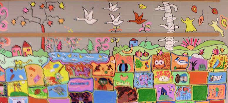 It was a five day project and we had close to three hundred participants. Working in collaboration with art teacher Erin Wainwright made all of this possible. As well, we had the help of very motivated teachers and parents. Even the Principal, Mme. C ,took part in it, painting the leaves of the birch tree in one of the panels.