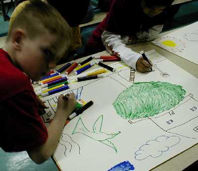 The first day looks at collaboration (boundaries - keeping or crossing them) and painting (balance, colour, composition), especially as it relates to monumental works (seen from a distance). Drawing exercises on a small scale practice collaboration. Exercises are analyzed. The mural is prepared.