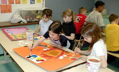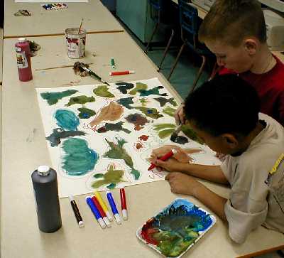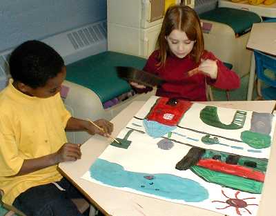 The second day the mural is painted. Discussion continues on the elements of painting, collaboration and introduces the art of compromise (individual versus group identity).