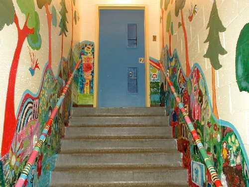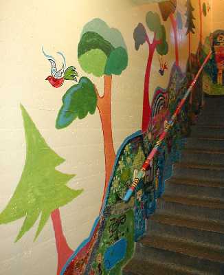 The descent to nature is also a descent into the school cafeteria. A nice way to nourish the body and spirit of the students. Great theme!