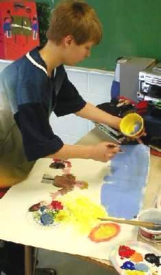 The second day the mural is painted. Discussion continues on the elements of painting, collaboration and introduces the art of compromise (individual versus group identity).