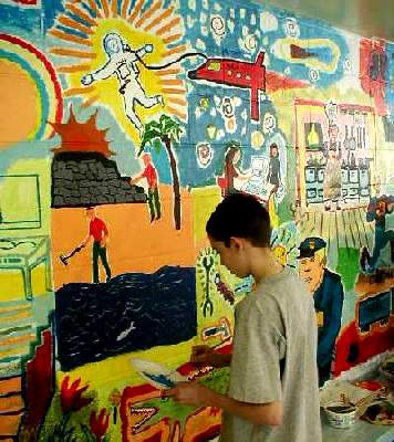 The workshop plans and executes a monumental collaborative painting (mural) over three days. The scale of a mural fosters great freedom of expression and artistic accomplishment within the context of cooperation and compromise.